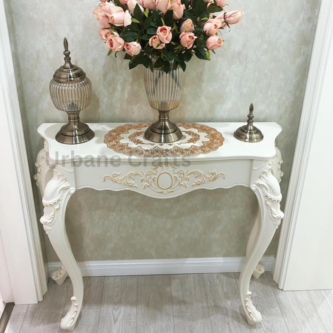 Urbane Crafts Wooden Carved Console Table | Solid Mango Wood, PU Finish | Decorative Table for Living Room, Hallway, Entryway, or Office | 48 x 30 x 15 Inches, White Deco